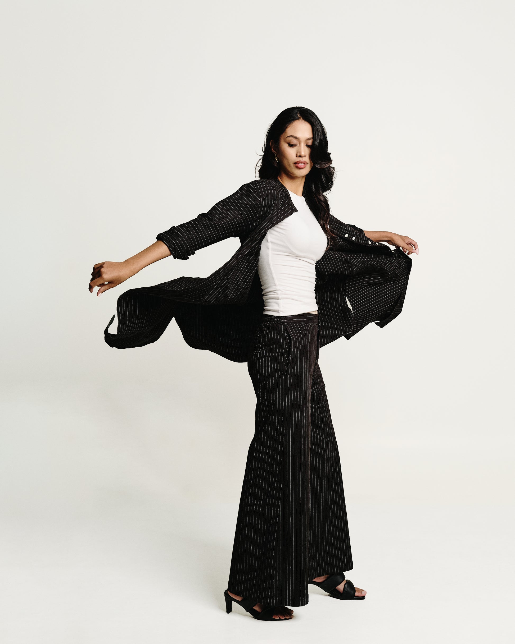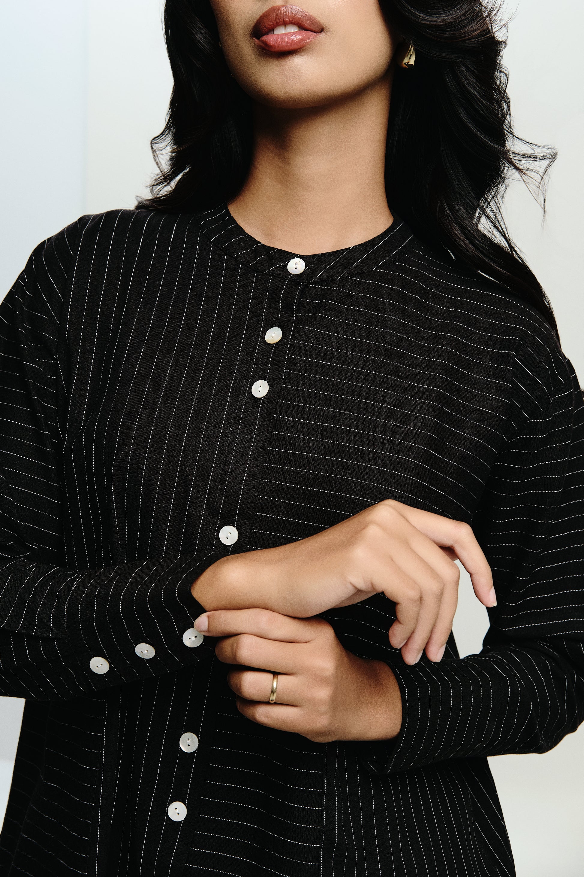 Indulge in the luxurious comfort and elegance of our Ebony Tunic Shirt. Crafted from a high-quality pinstriped linen blend, this long shirt features smart, buttoned sleeves and a sophisticated button-up collar. Complete with side pockets and slits, it can be worn as a standalone piece or paired with our Ebony wide leg pants for a sophisticated set. Elevate your formal and casual looks with this versatile and timeless addition to your wardrobe.