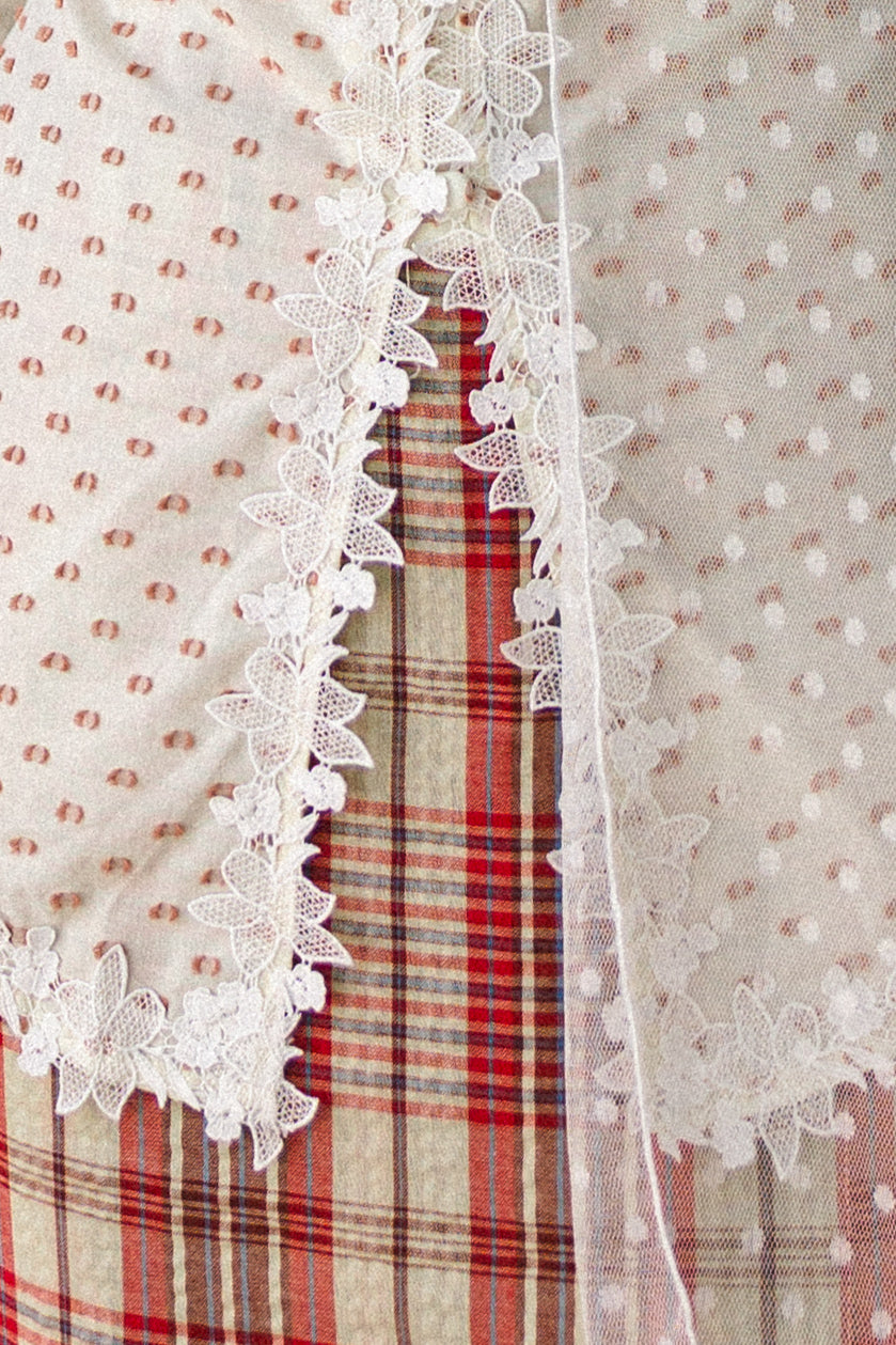 A modern Nyonya-inspired kebaya with polka texture and lace details, paired with a bold plaid skirt. Feminine, confident, and designed to be worn far beyond Raya.