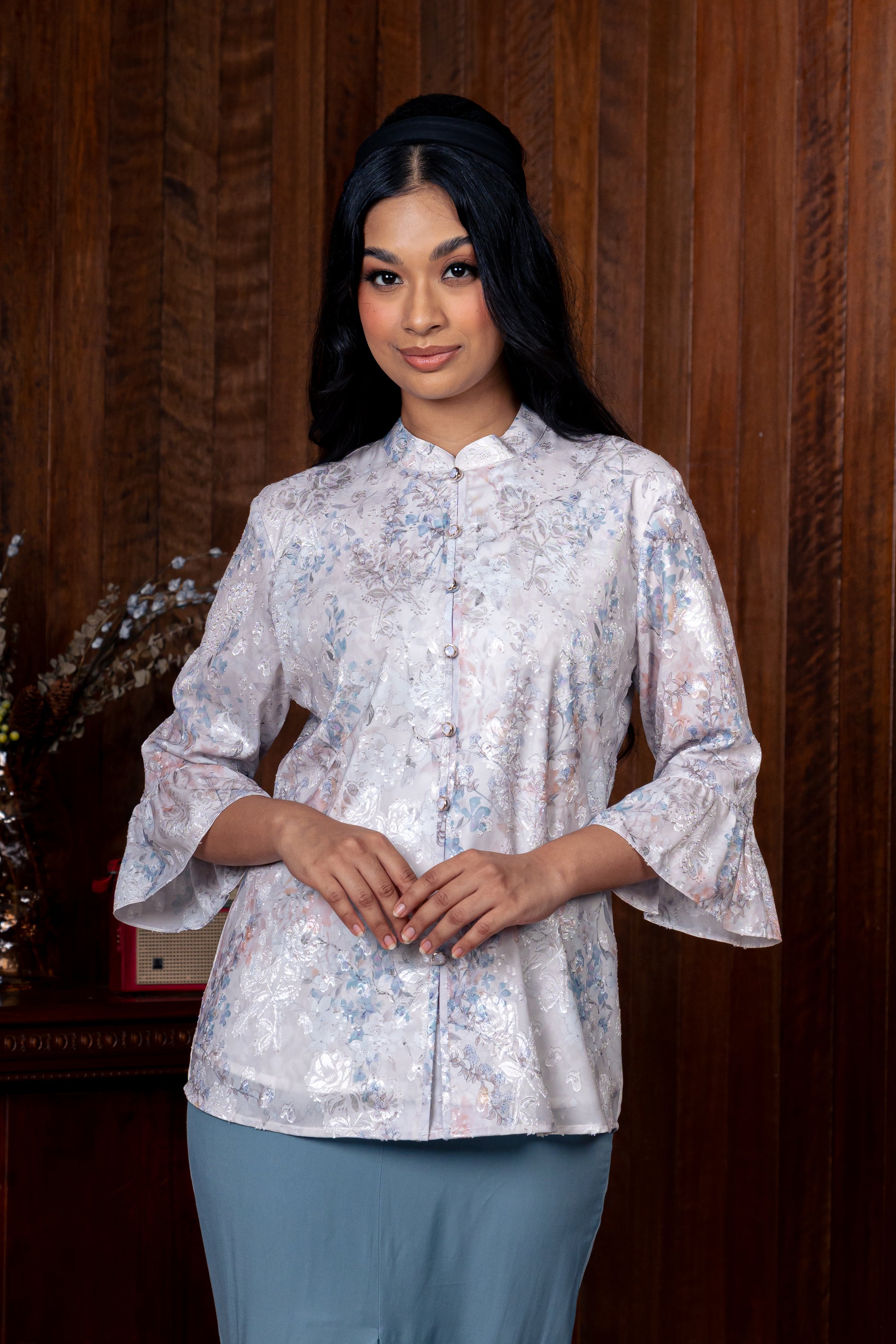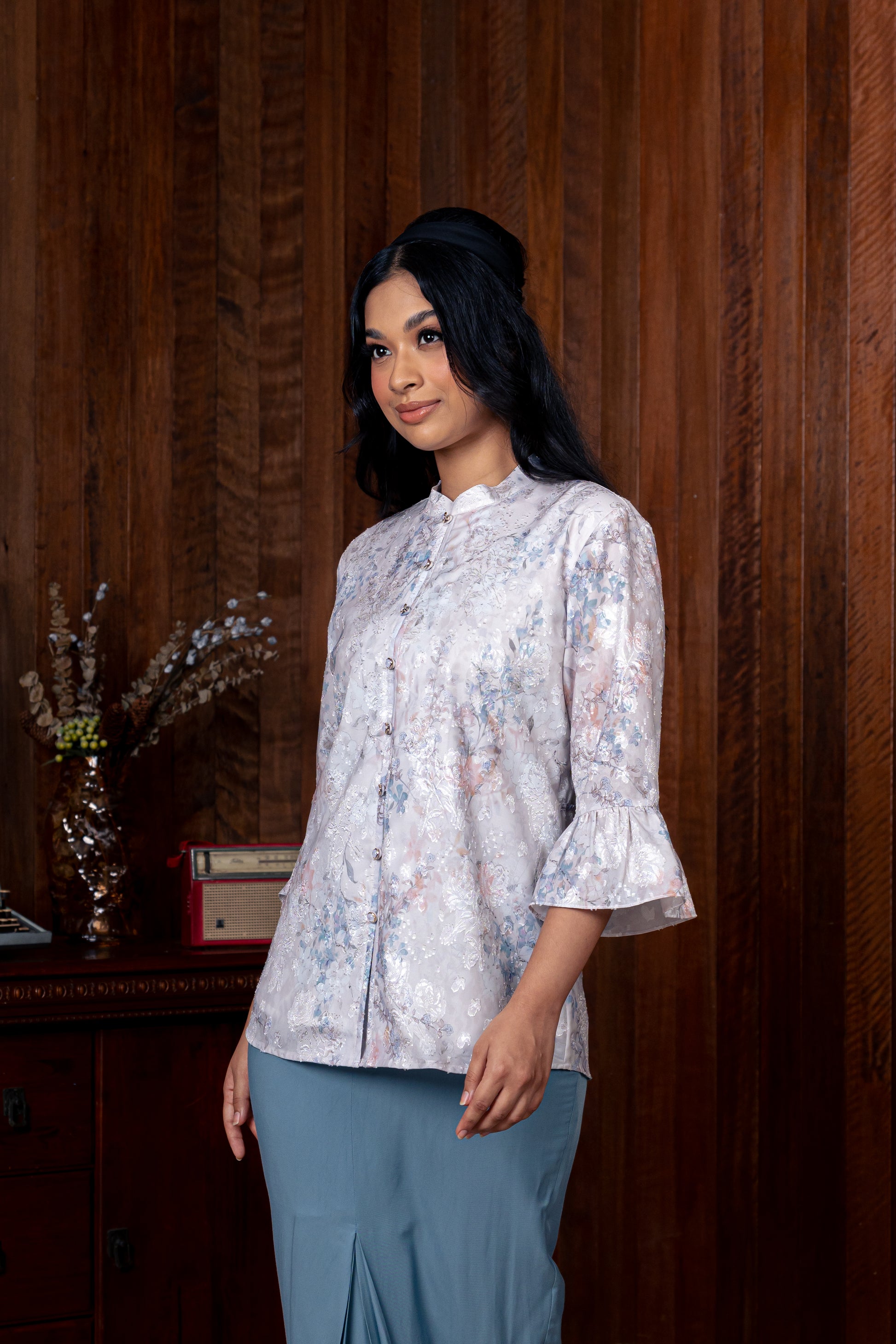 The Sarimah Blouse is a contemporary take on the timeless short kebaya, merging classic femininity with modern sophistication. Its mandarin collar honors Asian heritage with a polished edge, while the delicate ruffled sleeves evoke nostalgic charm from the ’60s.